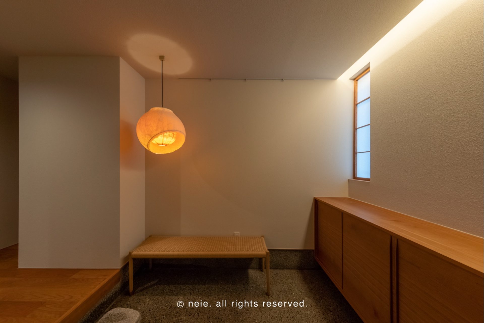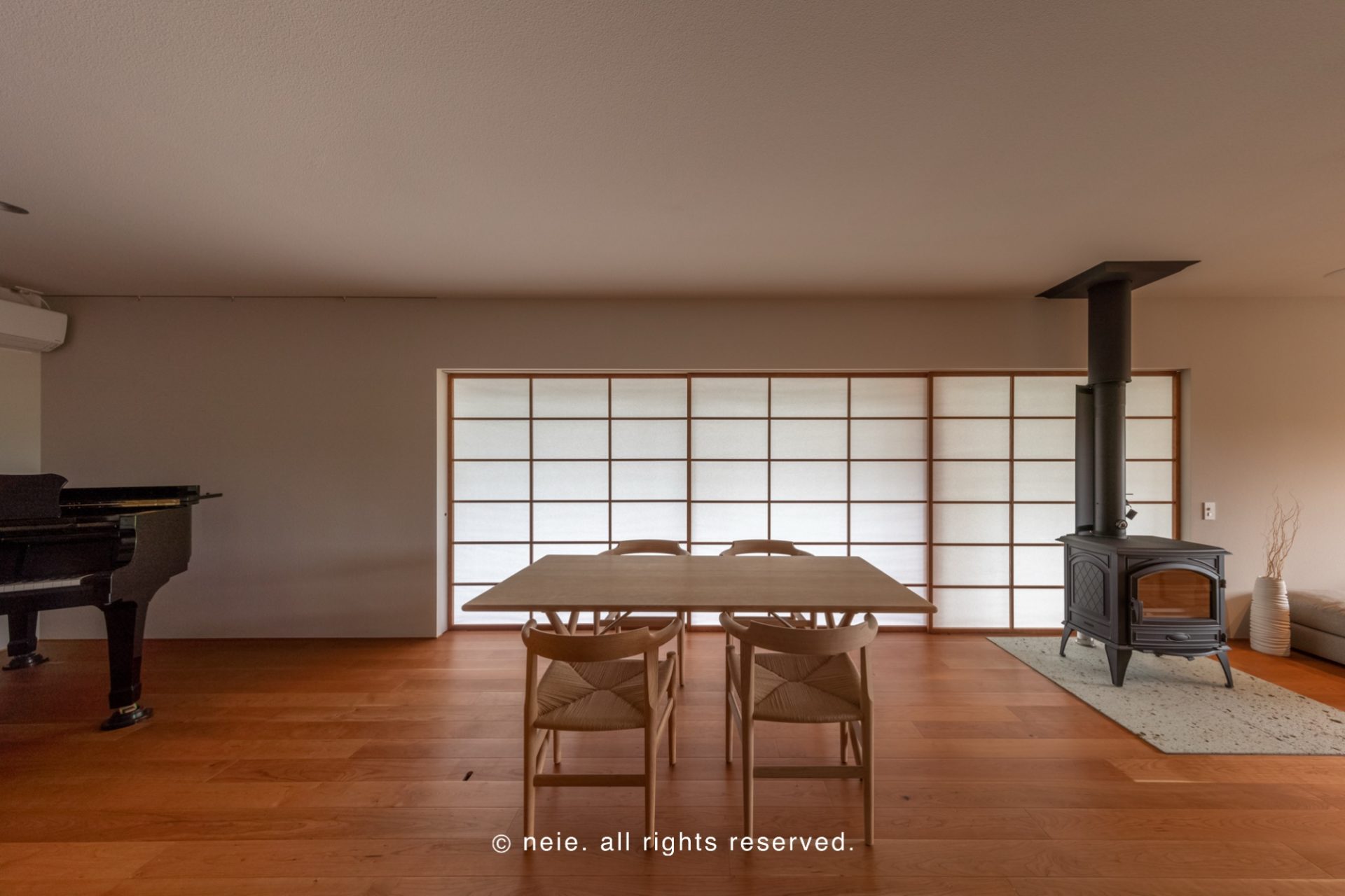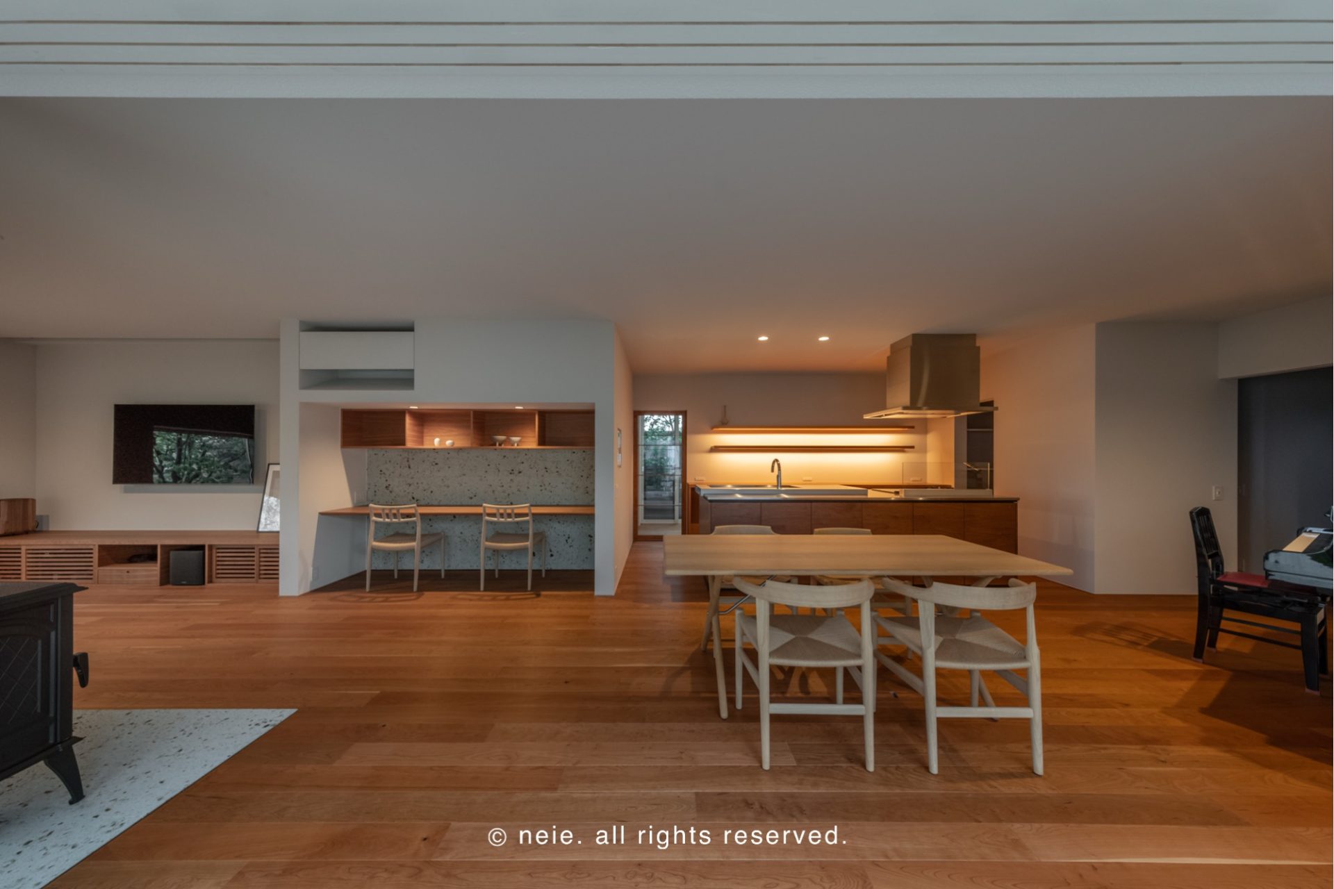 works HOME建築事例二つの景色と、移ろう庭のある家 二つの景色と、移ろう庭のある家 前面に都市の活気を、背面に雄大な自然の眺めを抱く住まい。 和の趣から洋の佇まいへと緩やかに移ろう庭を巡れば、季節ごとの発見が待っています。ふと視線を向けた窓辺が切り取る何気ない風景もまた、心を和ませる小さな喜びに。 二つの景色を日々味わう暮らしが始まります。 Tags #ワークスペース #和室 #塗り壁 #平屋 #庭 #薪ストーブ #趣味室 #造作キッチン #造作家具 #造作洗面台